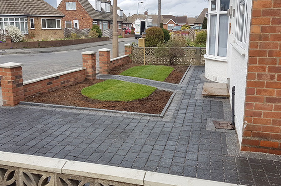 A very dated and bland driveway and garden were in much need of a major overhaul here! We started this job by getting it all back to basics by breaking out all the old concrete and boundary wall. All the old gravel in the front garden was gone, and old turf in the back garden ripped up and disposed of. Starting in the back, we laid fresh new locally sourced turf, allowing space for new plants to add a bit of colour around the boundary. At the far end, we erected 4 timber posts, and threaded steel wire through them to create an area for some climbing plants. We laid the new paths around the house, garden path and driveway with Marshall's Granite Block Paving, edging it with Marshall's Grey Block Paving to really enhance the colours. New walls were built along the driveway and at the front perimeter topping them off with new copings. And to finish the front off, a new oval lawn was laid, split by the garden path.